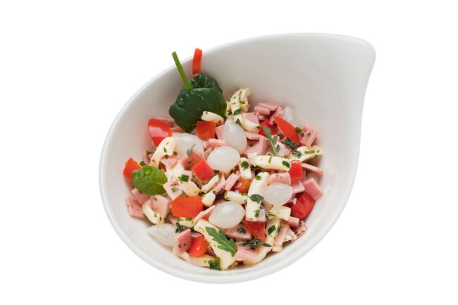 Wurstsalat aus Fleischbrät, Perlzwiebeln und Emmentaler Käse mit klarem Dressing